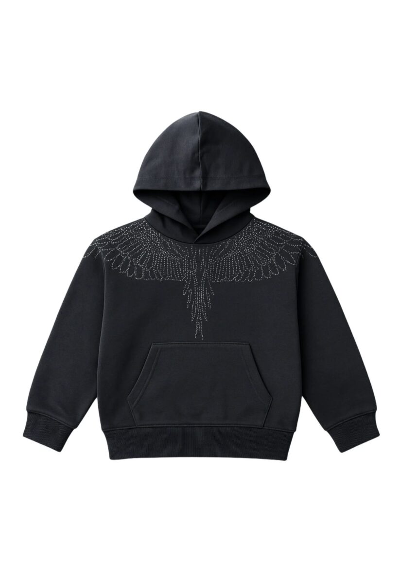 Cappuccio fisso con tasca a marsupio. La parte superiore รจ caratterizzata dal disegno iconico con strass tono su tono. Realizzata in spugna di cotone.